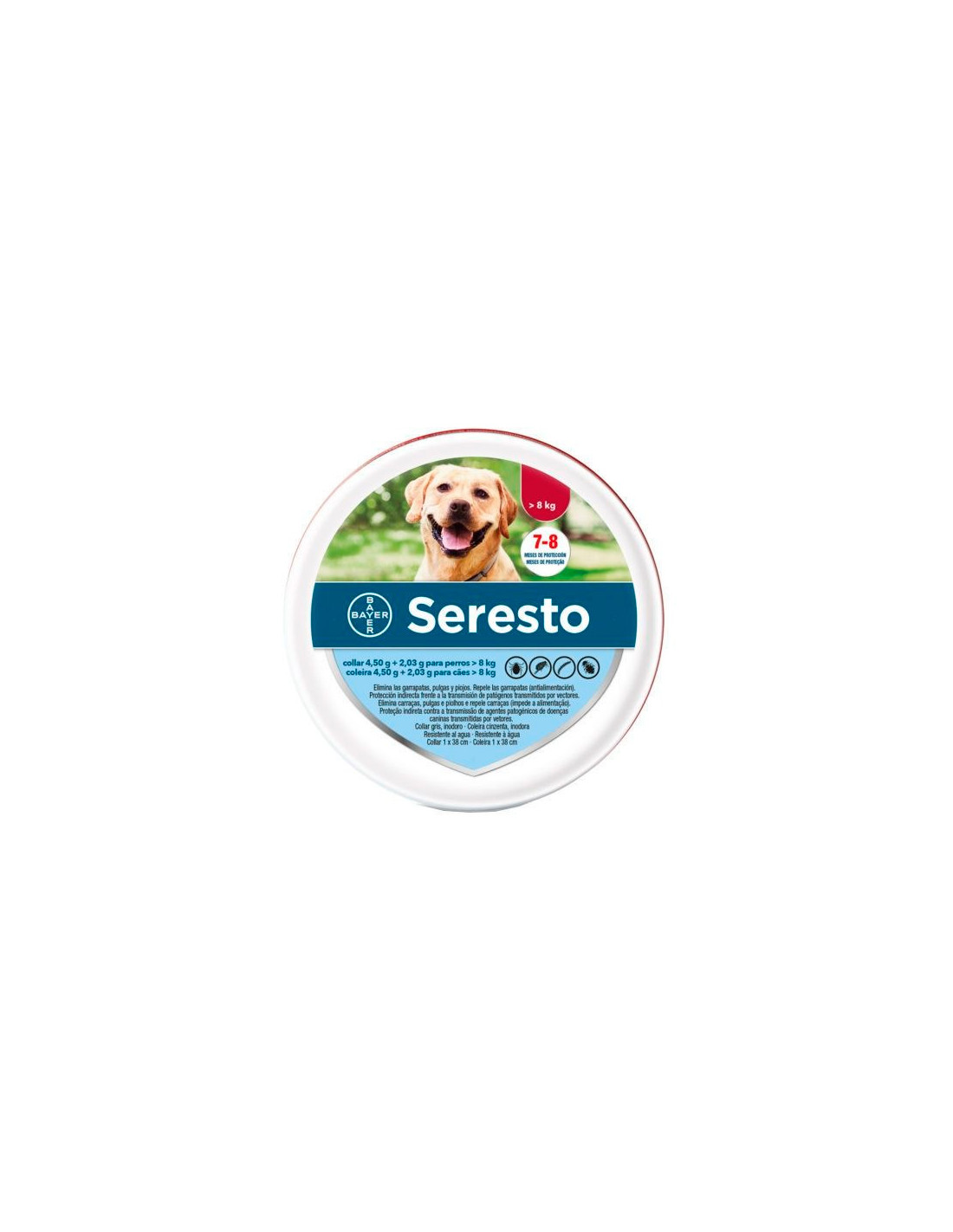 El collar antiparasitario Seresto de larga duración previene y trata la infestación por pulgas durante 7 - 8 meses. Protege de modo indirecto frente a la transmisión de los patógenos Babesia canis vogeli y Ehrlichia canis por la garrapata Rhiphicephalus sanguineus y en consecuencia, se disminuye el riesgo de babesiosis canina y ehrliquiosis canina durante 7 meses. Además, reduce el riesgo de infección por Leishmania a través de la transmisión por flebótomos durante 8 meses.