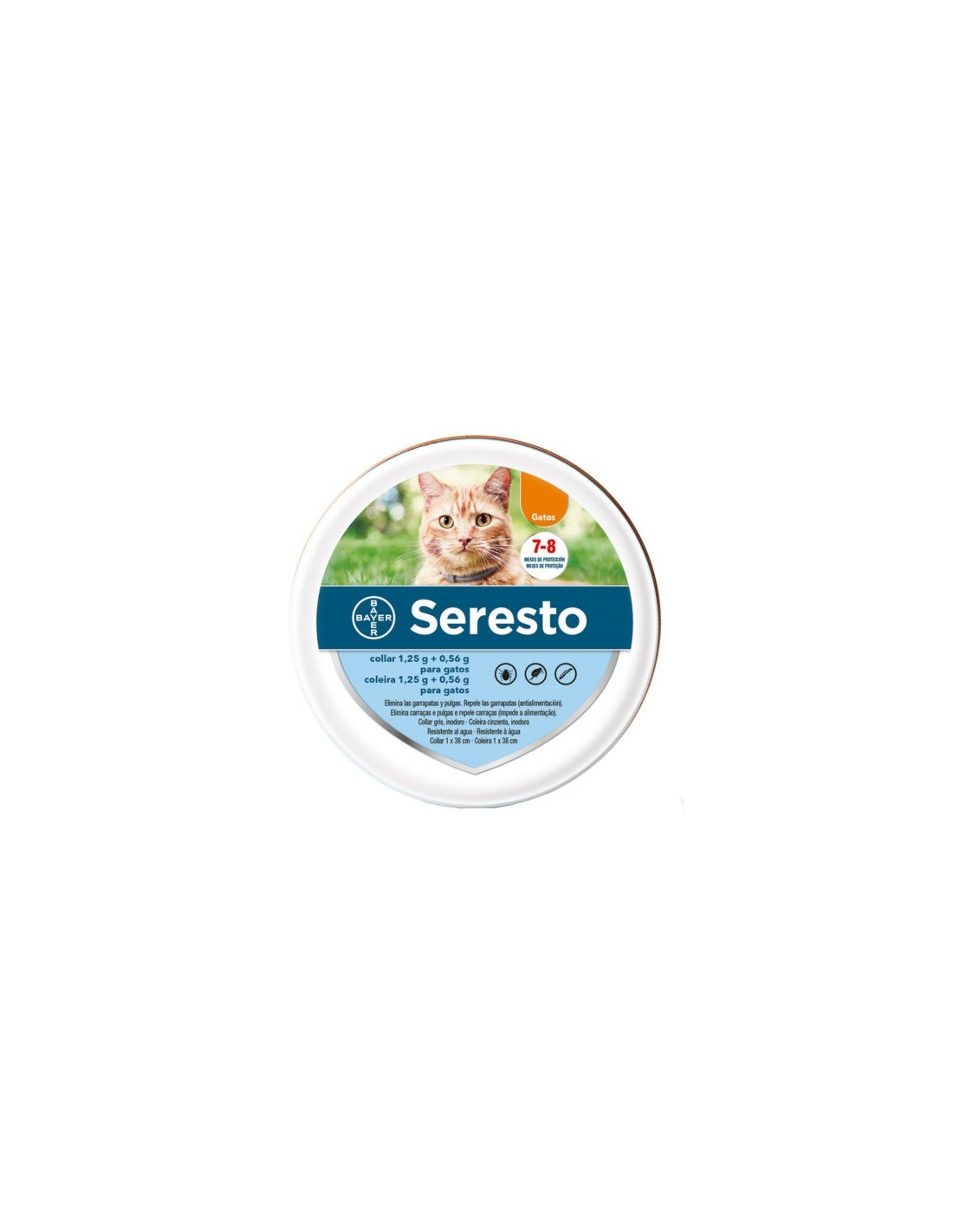 Collar antiparasitario para gatos a partir de 10 semanas de edad, con ocho meses de protección contra garrapatas y pulgas. Tamaño ajustable al cuello del gato, con 38 cm de diámetro.